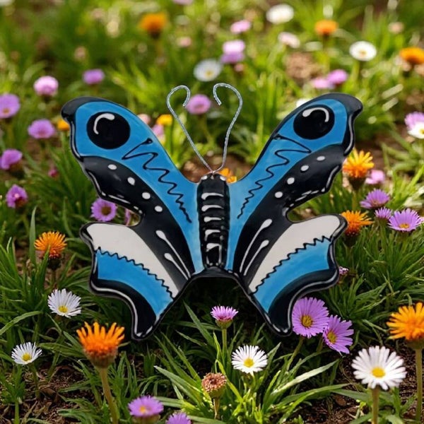 Laat je Tuin / Balkon tot leven komen met deze handbeschilderde vlinders keramiek. Met het ijzerdraadje dat ook de voelsprieten van de vlinders vormt, hang je deze kleurrijke vlinders heel eenvoudig op aan een spijker aan muur of schutting.